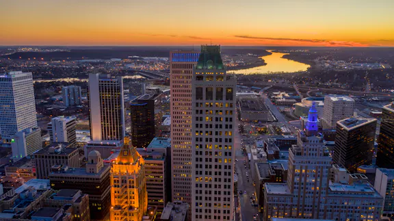 Tulsa Oklahoma downtown aeriel view at sunset